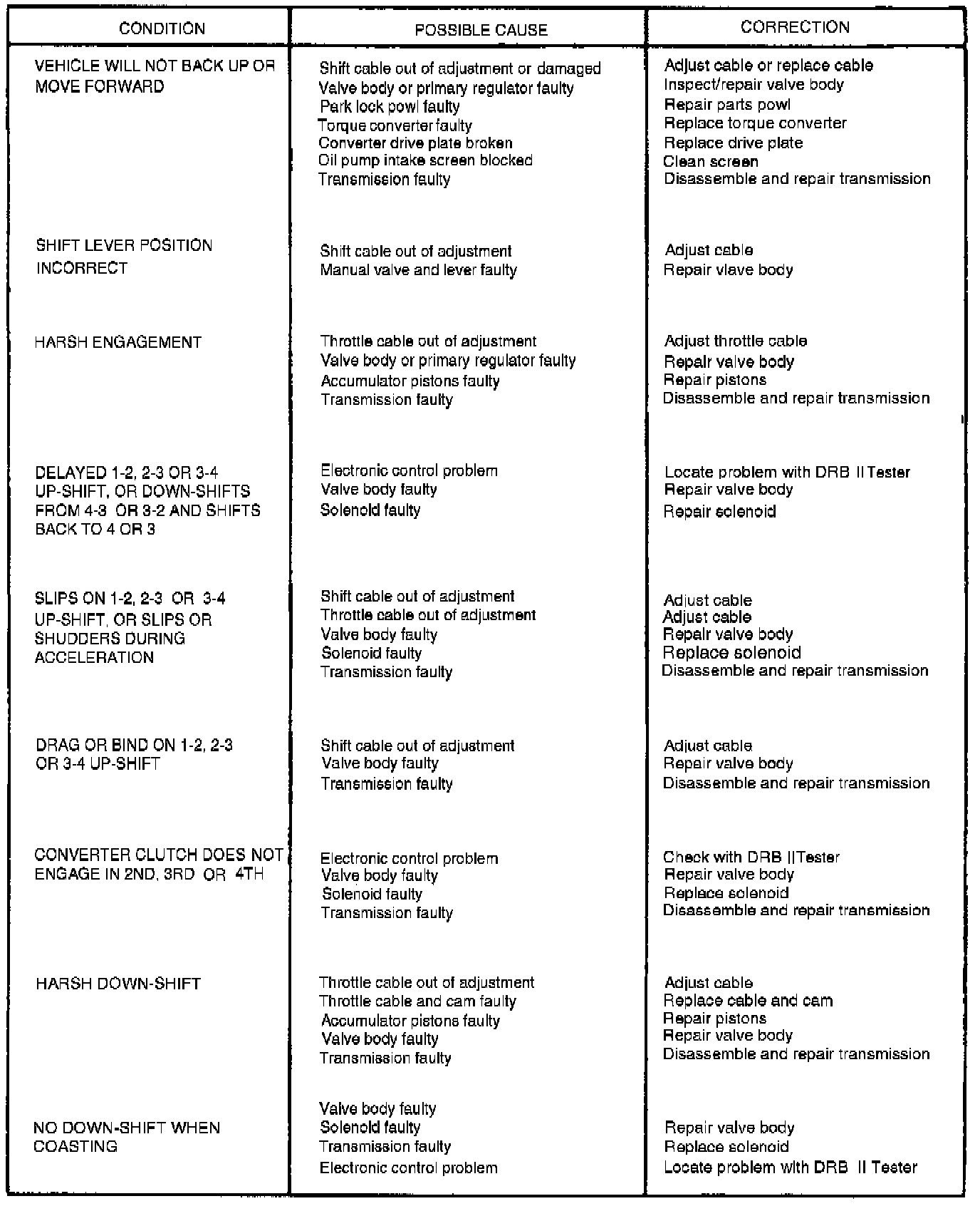 Prior to performing any troubleshooting, the general engine operation, transmission shift linkage, line pressure cable, transmission fluid level, throttle cable and [1][2]throttle position sensor should be checked and adjusted as necessary. For transmission troubleshooting refer to Fig. 2.