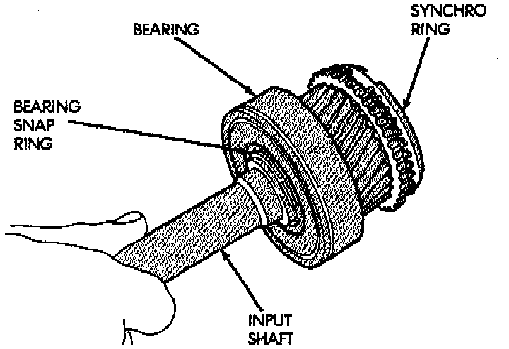 1. Position input shaft bearing onto input shaft. Be sure that the snap-ring groove in the bearing is facing forward.