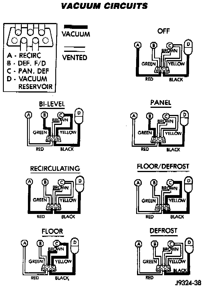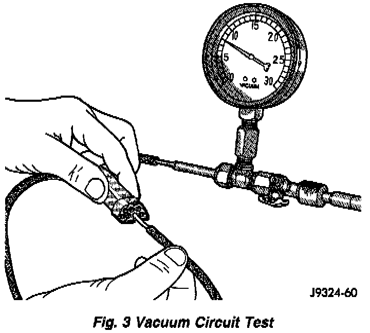 Connect the calibrated vacuum hose probe to each port in the vacuum harness connector. After each connection is made, the test gauge should return to calibrated setting. If all circuits function properly, replace heater-A/C control. If not, determine the color of the vacuum circuit that is leaking. To determine vacuum line colors, refer to the Vacuum Circuits chart for the heater and manual A/C units. Disconnect the vacuum actuator at the other end of the circuit. Instrument panel removal may be necessary to gain access to some components. Block the end of the disconnected vacuum line. The test gauge should return to calibrated setting. If not, that circuit has a leak and must be repaired or replaced. If test gauge returns to calibrated setting, the vacuum actuator must be replaced.