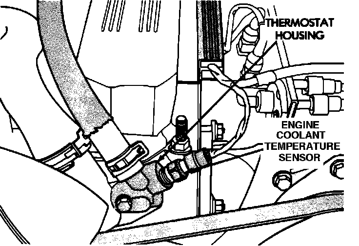 WARNING: HOT, PRESSURIZED COOLANT CAN CAUSE INJURY BY SCALDING. COOLING SYSTEM MUST BE PARTIALLY DRAINED BEFORE REMOVING THE COOLANT TEMPERATURE SENSOR.NOTE: The coolant temperature sensor is installed in the thermostat housing.