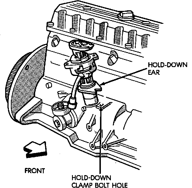 4. Visually line up the hold-down ear of the distributor housing with the hold-down clamp hole.