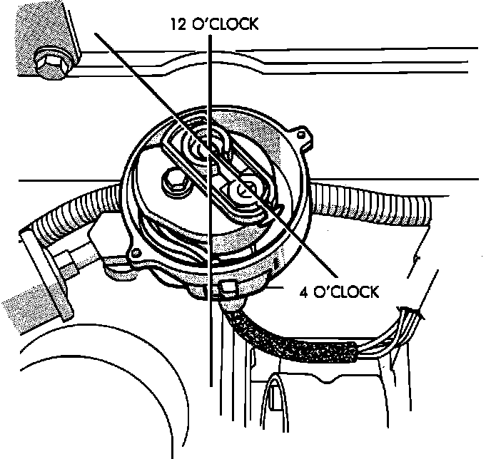 7. The rotor should be in the 5 o'clock position with the trailing edge of the rotor blade lined up with the scribe mark in the distributor housing.