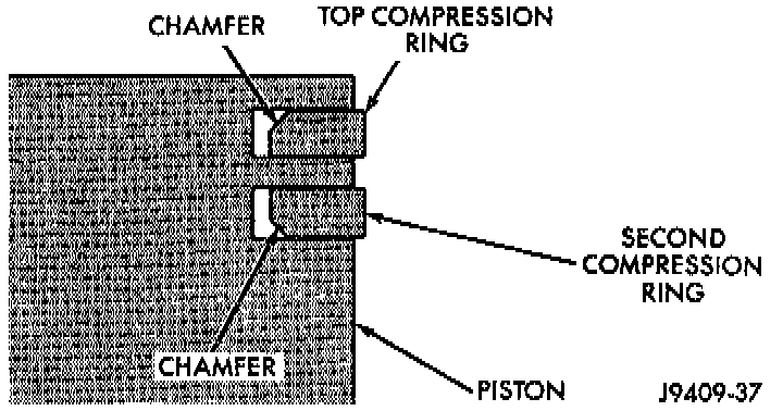 b. Install the second compression rings using Installation Tool C-4184, or equivalent. The compression rings must be installed with the identification mark face up (toward top of piston) and chamfer facing down. An identification mark on the ring is a drill point, a stamped letter "O", an oval depression, or the word "TOP".