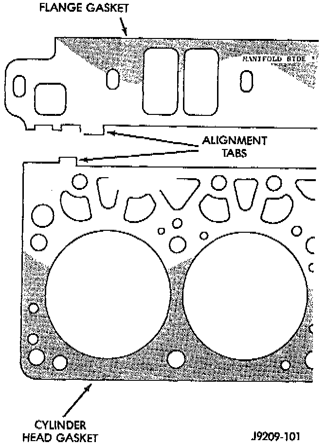5. Install the flange gaskets. Ensure that the vertical port alignment tab is resting on the deck face of the block. Also the horizontal alignment tabs must be in position with the mating cylinder head gasket tabs. The words MANIFOLD SIDE should be visible on the center of each flange gasket.