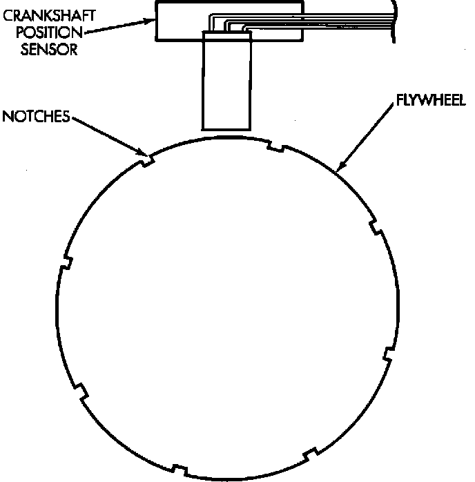 The notches cause a pulse to be generated when they pass through the switch. The pulses are input to the PCM. The flywheel/driveplate has 8 single notches spaced every 45 degrees. For each engine revolution there are 8 single pulses generated.
