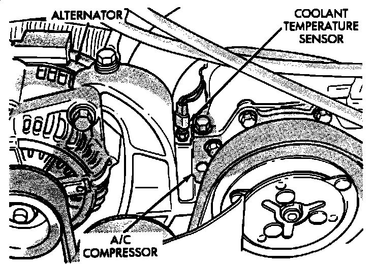 WARNING: HOT, PRESSURIZED COOLANT CAN CAUSE INJURY BY SCALDING. COOLING SYSTEM MUST BE PARTIALLY DRAINED BEFORE REMOVING THE COOLANT TEMPERATURE SENSOR.NOTE: The coolant temperature sensor is installed next to the thermostat housing and protrudes into the water jacket.
