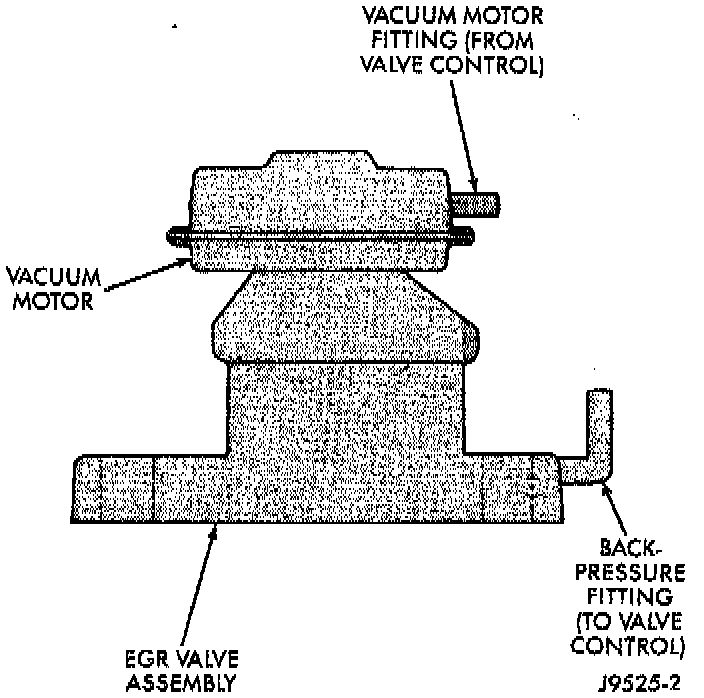 1. All engines are equipped with two fittings located on the EGR valve. The upper fitting (located on the vacuum motor) supplies engine vacuum to a diaphragm within the EGR valve for valve operation. The lower fitting (located on the base of the EGR valve) is used to supply exhaust back-pressure to the EGR valve control.