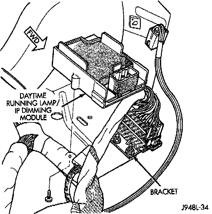 The Daytime Running Light Module (DRL) is located on a bracket, to the left of the steering column, on the underside of the instrument panel.