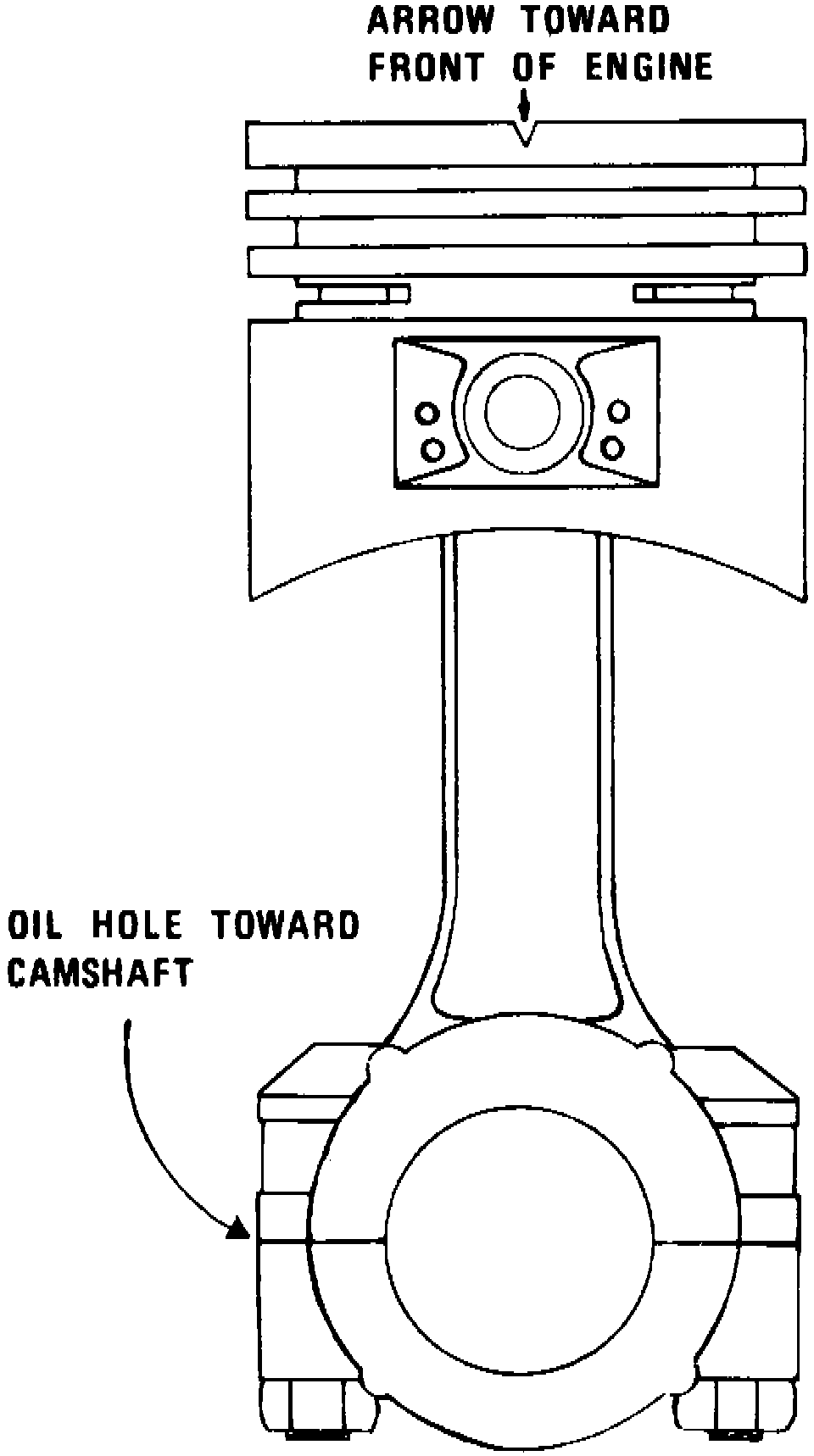 Pistons are marked with an arrow on the top perimeter, Fig.10. When installing piston in engine, the arrow must face toward front of engine. Always assemble rods and caps with oil spurt holes facing camshaft. Check side clearance between connecting rod and crankshaft journal. Clearance should be 0.010 to 0.019 inch.