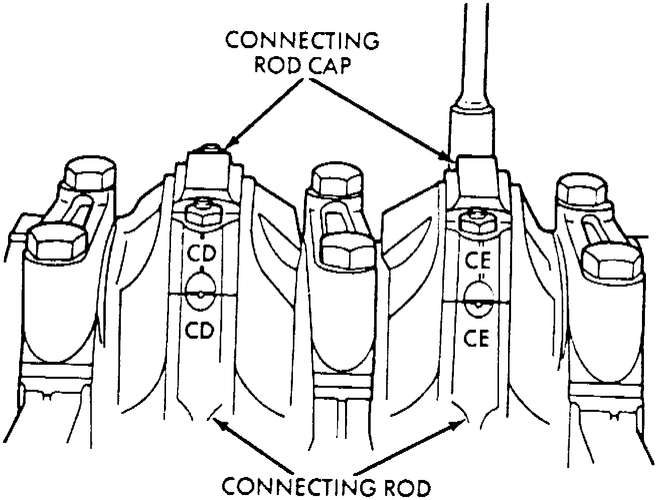 6. Remove connecting rod bearing caps and inserts. Mark rods and caps with cylinder bore location. Connecting rods and caps are stamped with a two letter combination Fig.11.