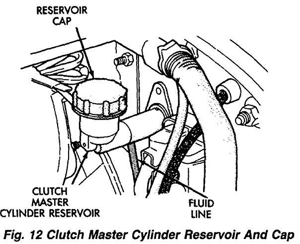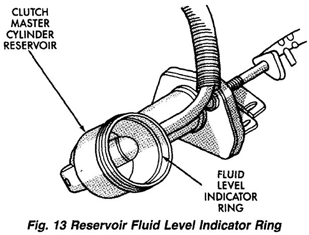 Clutch fluid level is checked at the master cylinder reservoir (Fig. 12). An indicator ring is provided either on the side, or interior rim of the reservoir (Fig. 13).