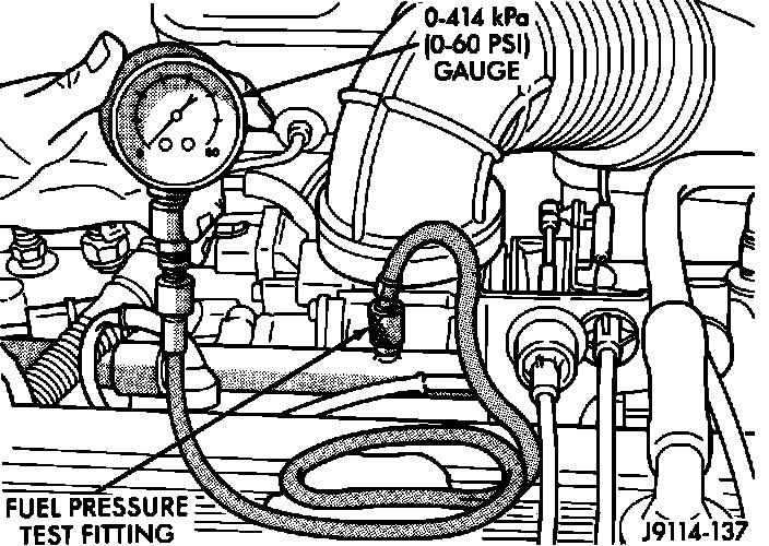 NOTE: The fuel system employs a vacuum assisted pressure regulator. System fuel pressure should be approximately 214 kPa (31 psi) with the vacuum line connected to the regulator. With the vacuum line disconnected from the regulator, fuel pressure should be approximately 269 kPa (39 psi). This is 55-69 kPa (8-10 psi) higher.Fuel Pressure Test: