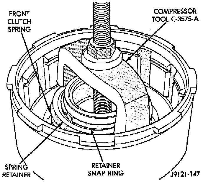 2. Compress clutch piston spring with Compressor Tool C-3575-A, or equivalent. Be sure legs of tool are seated squarely on spring retainer before compressing spring.