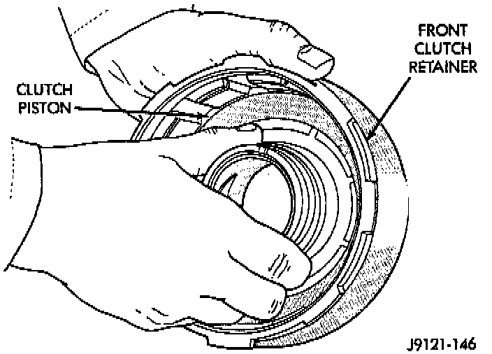 4. Install clutch piston in retainer. Use twisting motion to seat piston in bottom of retainer. A thin strip of plastic (about 0.020" thick), can be used to guide seals into place if necessary.