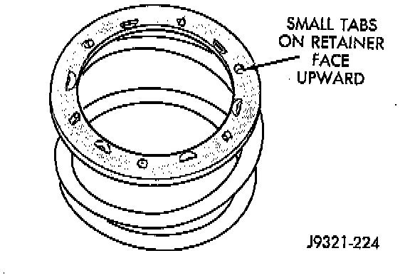 6. Position spring retainer on top of piston spring. Make sure retainer is properly installed. Small raised tabs should be facing upward. Semicircular lugs on underside of retainer are for positioning retainer in spring.