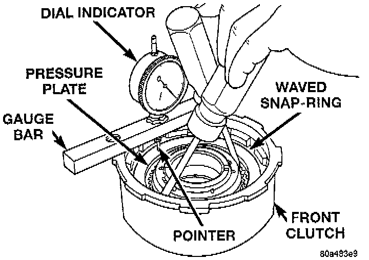 a. Position gauge bar across the clutch drum with the dial indicator pointer on the pressure plate.