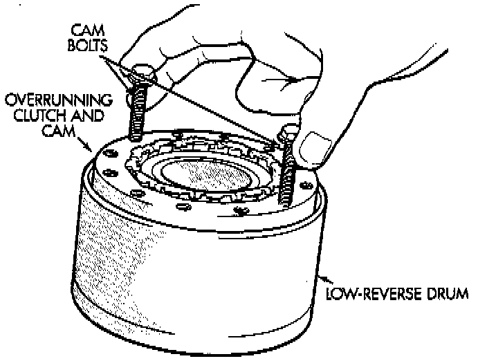 If the clutch assembly came out with the low-reverse drum, thread two clutch cam bolts into the cam. Then lift the cam out of the drum with the bolts. Rotate the cam back and forth to ease removal if necessary. Remove the clutch roller and spring assembly from the race afterward.