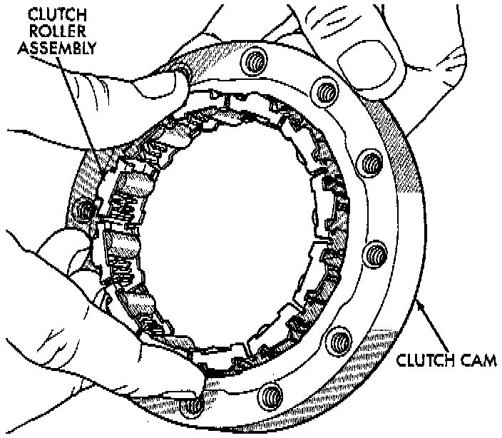 2. Install overrunning clutch roller, spring and retainer assembly in clutch cam.
