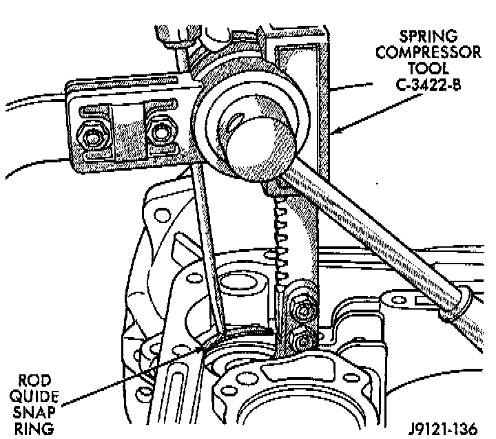 2. Install front servo piston, spring and rod guide. Compress front servo rod guide with Valve Spring Compressor C-3422-B, or equivalent and install servo snap ring.