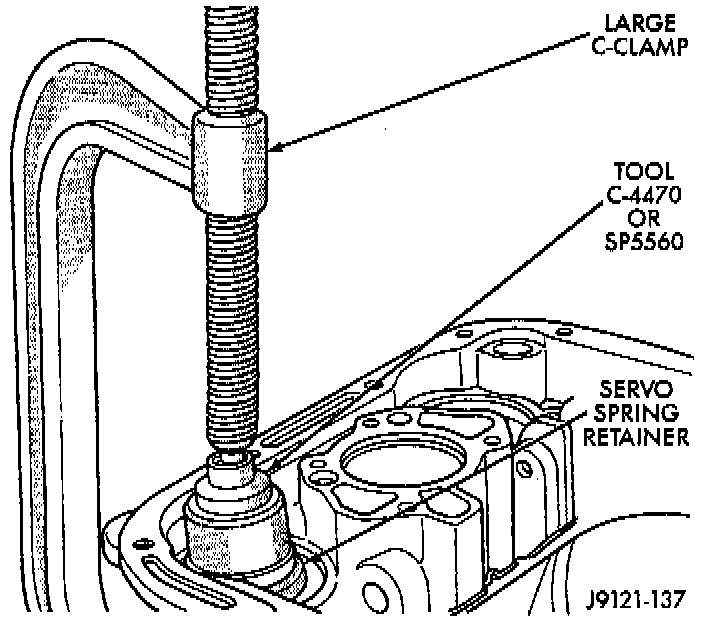 NOTE: Disassemble, clean, inspect, assemble, and adjust internal components as necessary before assembling transmission.1. Install rear servo piston, spring and spring retainer. Compress rear servo spring and retainer with Compressor Tool C-3422-B or a large C-clamp.