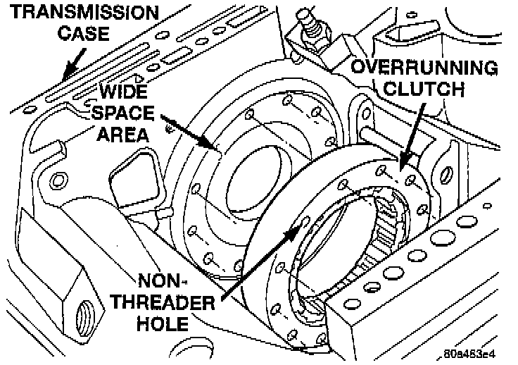 11. Insert awl tip into the threaded hole next to the non-threaded hole in the overrunning clutch cam. Verify that non-threaded hole is aligned with wide space area on transmission case.