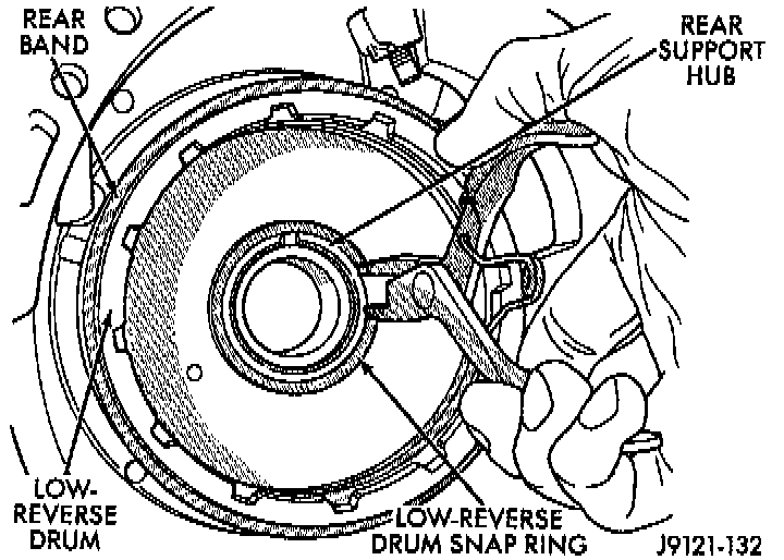 18. Install snap ring to retain low-reverse drum to hub of rear support.