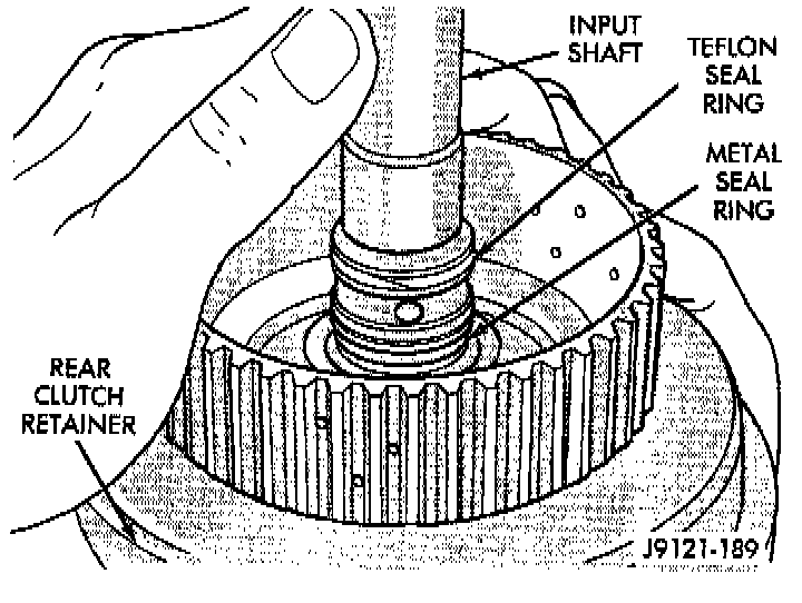 a. Check input shaft seal rings. Verify that diagonal-cut ends of Teflon seal ring are properly joined and ends of metal ring are correctly hooked together. Also be sure rings are installed in sequence shown.