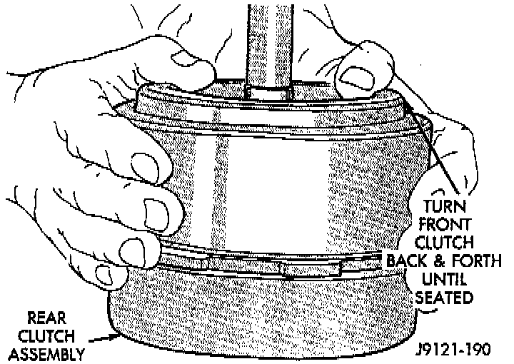 d. Engage teeth on rear clutch hub into teeth on clutch. Rotate front clutch retainer back and forth until completely seated on rear clutch.