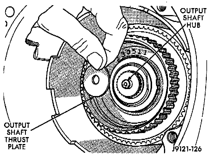 NOTE: If end play is incorrect, transmission is incorrectly assembled, or output shaft thrust washer and/or thrust plate are worn and need to be changed.