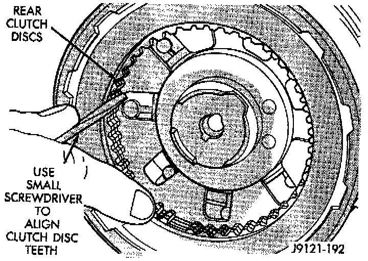28. Align drive teeth on rear clutch discs with small screwdriver. This will make installation into front of planetary gear-train easier.