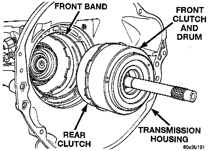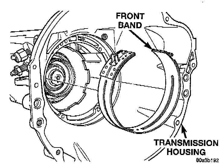b. Insert rear band through pan opening in transmission case.