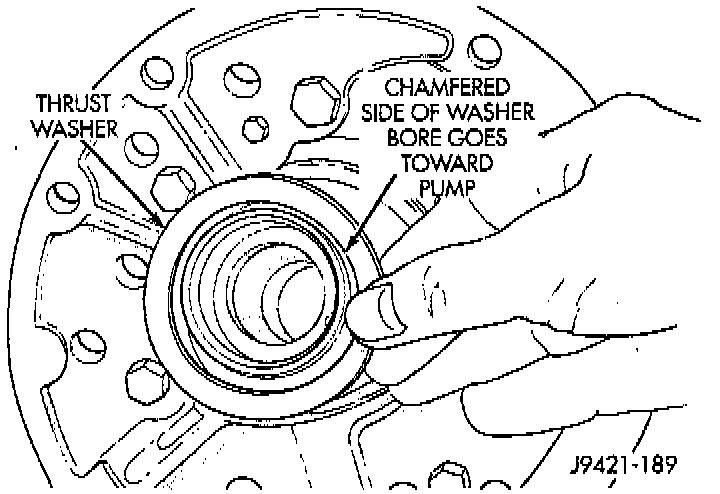 CAUTION: The thrust washer bore (I.D.), is chamfered on one side. Make sure the chamfered side is installed so it faces the pump.
