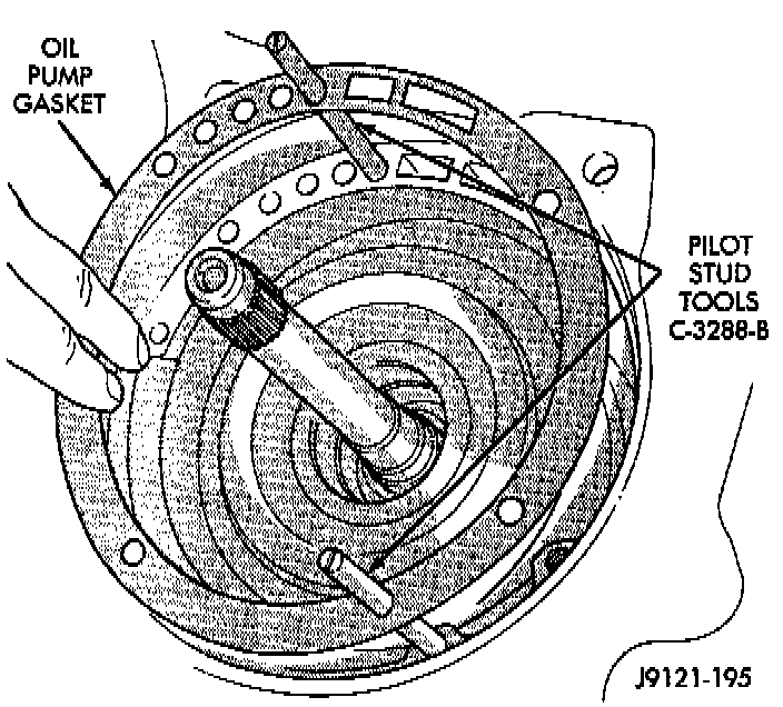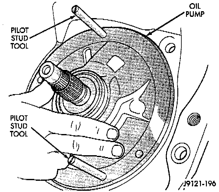 40. Install oil pump. Align and position pump on pilot studs. Slide pump down studs and work it into front clutch hub and case by hand. Then install two or three pump bolts to hold pump in place.