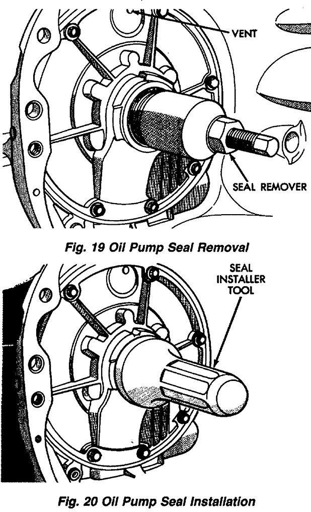 Use an externally threaded tool to remove the seal (Fig. 19). To install the seal, use a standard seal driver of the correct size (Fig. 20). Be sure to lubricate the pump seal and converter hub with transmission fluid or petroleum jelly before installation.