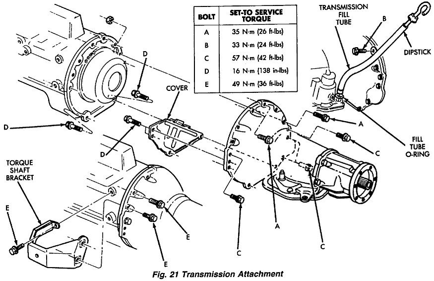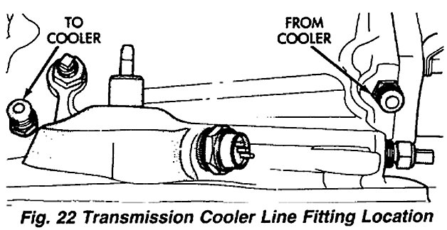 8. Install and tighten remaining bolts that attach transmission converter housing to engine block. Refer to Fig. 22 for cooler line identification.
