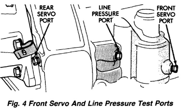 (1) Connect one test gauge to line pressure port and other gauge to front servo pressure port (Fig. 4). Either gauge can be used at either port.