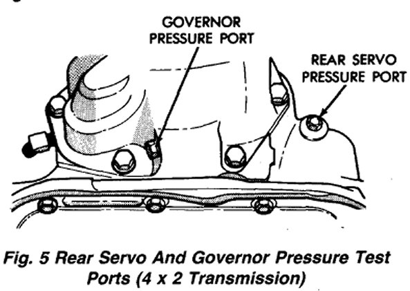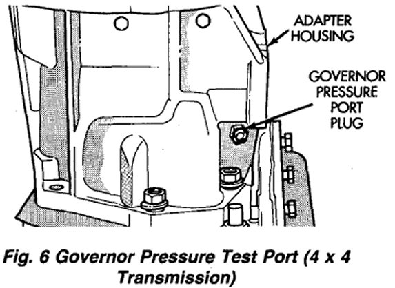 On 4 x 2 models, the governor pressure port is at the left side of case at the transmission rear (Fig. 5). On 4 x 4 transmissions, the test port is in the driver side of the adapter housing (Fig. 6). Transmission)