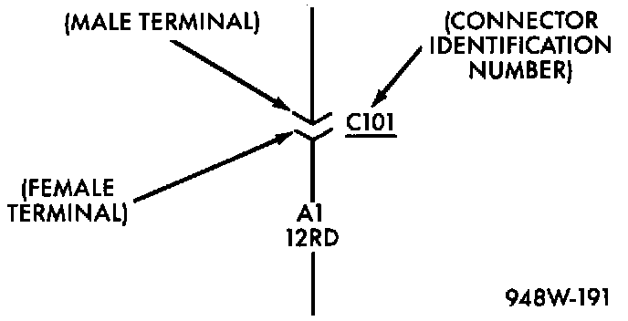 Connectors shown in the diagrams are identified using the international standard arrows for male and female terminals. A connector identifier is placed next to the arrows to indicate the connector number.