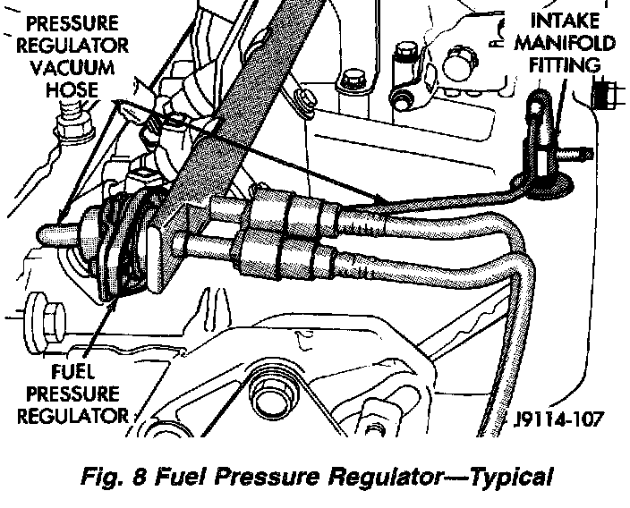 The fuel system is equipped with a vacuum assisted fuel pressure regulator (Figure 8). With engine at idle speed, system fuel pressure should be approximately 214 kPa (31 psi) with the vacuum line connected to the regulator. With the vacuum line disconnected from the regulator, fuel pressure should be approximately 269 kPa (39 psi). This is 55-69 kPa (8-10 psi) higher.