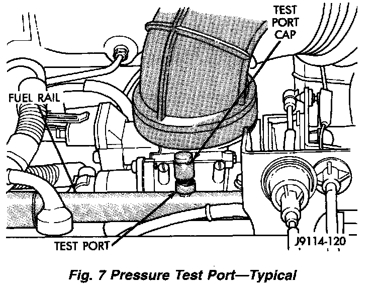 (1) Remove the protective cap at the fuel rail (Figure 7). Connect the 0-414 kPa (0-60 psi) fuel pressure gauge (from Gauge Set 5069) to test port pressure fitting on fuel rail (Figure 9).