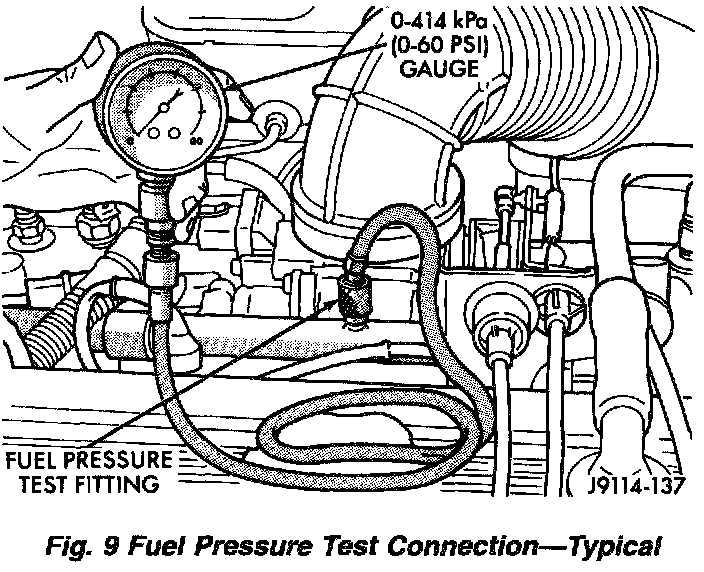 (2) Note pressure gauge reading. Fuel pressure should be approximately 214 kPa (31 psi) at idle.