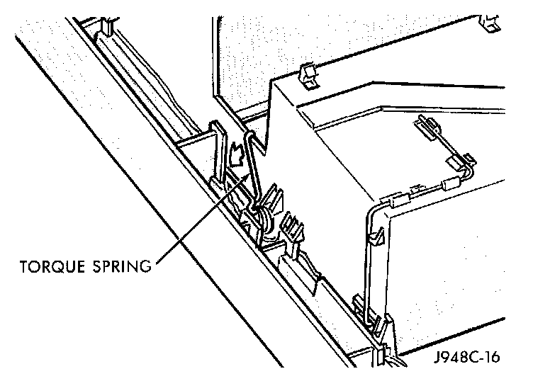 4. Unhook the torque spring from the wall of the console housing, and release the spring to the down position, as shown by the arrow in the image.