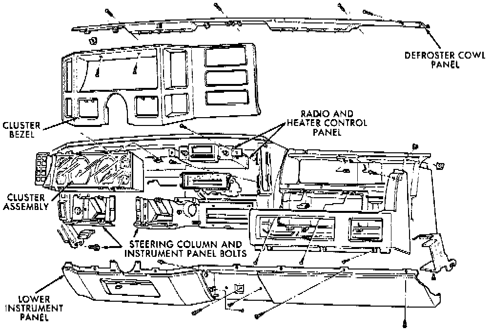 13. Remove instrument panel attaching bolts and steering column attaching bolts.