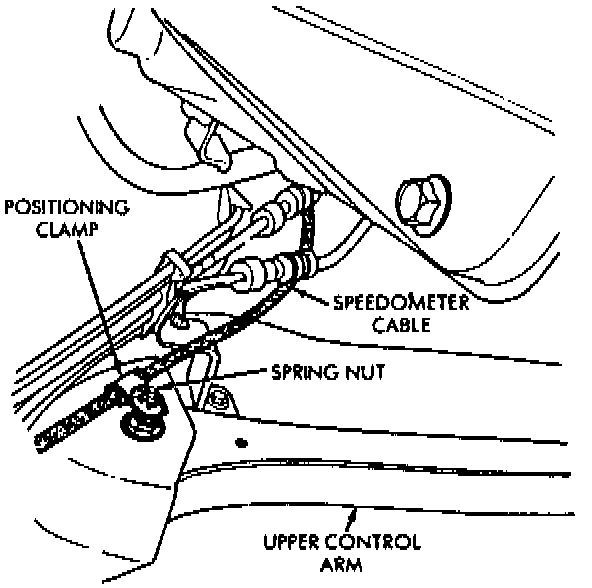 f. Carefully remove spring nut holding speedometer cable in position from lefthand upper control arm bolt.