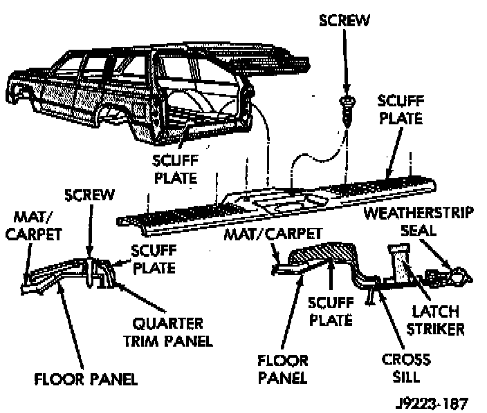 4. Position scuff plate on the carpet and cross sill, and install the retaining screws. Tighten the scuff plate screws to 1 Nm (11 in. lbs.) torque.