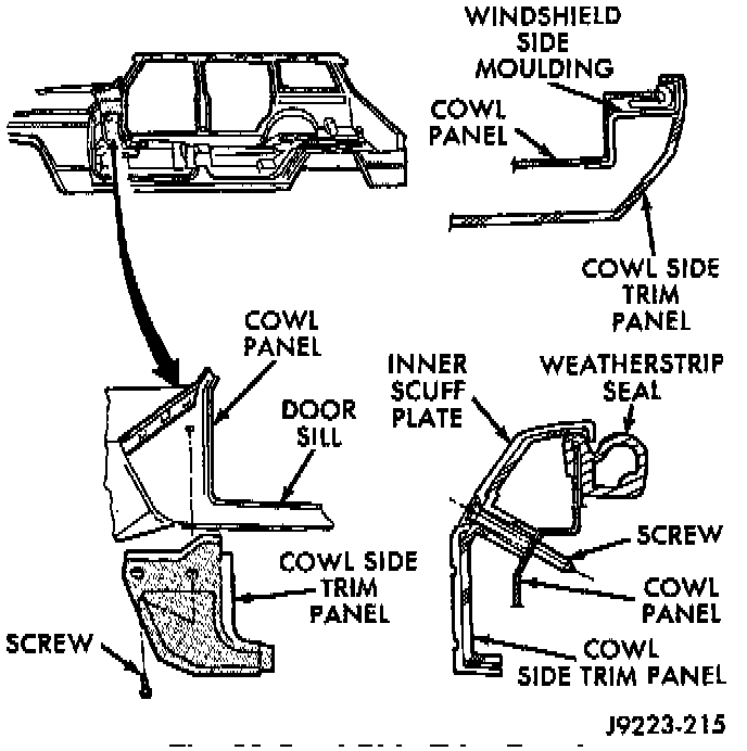 1. Remove the retaining screws and the inner scuff plate, cowl side trim panel and headliner front trim molding from the interior of the vehicle.