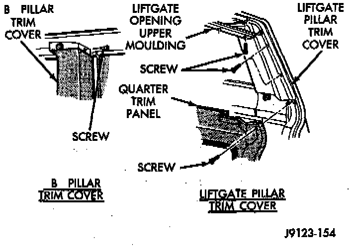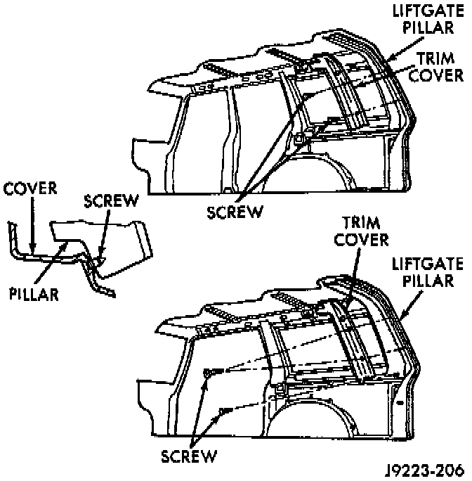 4. Remove the liftgate pillar trim screws and detach spring steel clips (2dr vehicles).