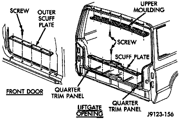 3. Remove the retaining screws and the liftgate scuff plate from the carpet and cross sill.