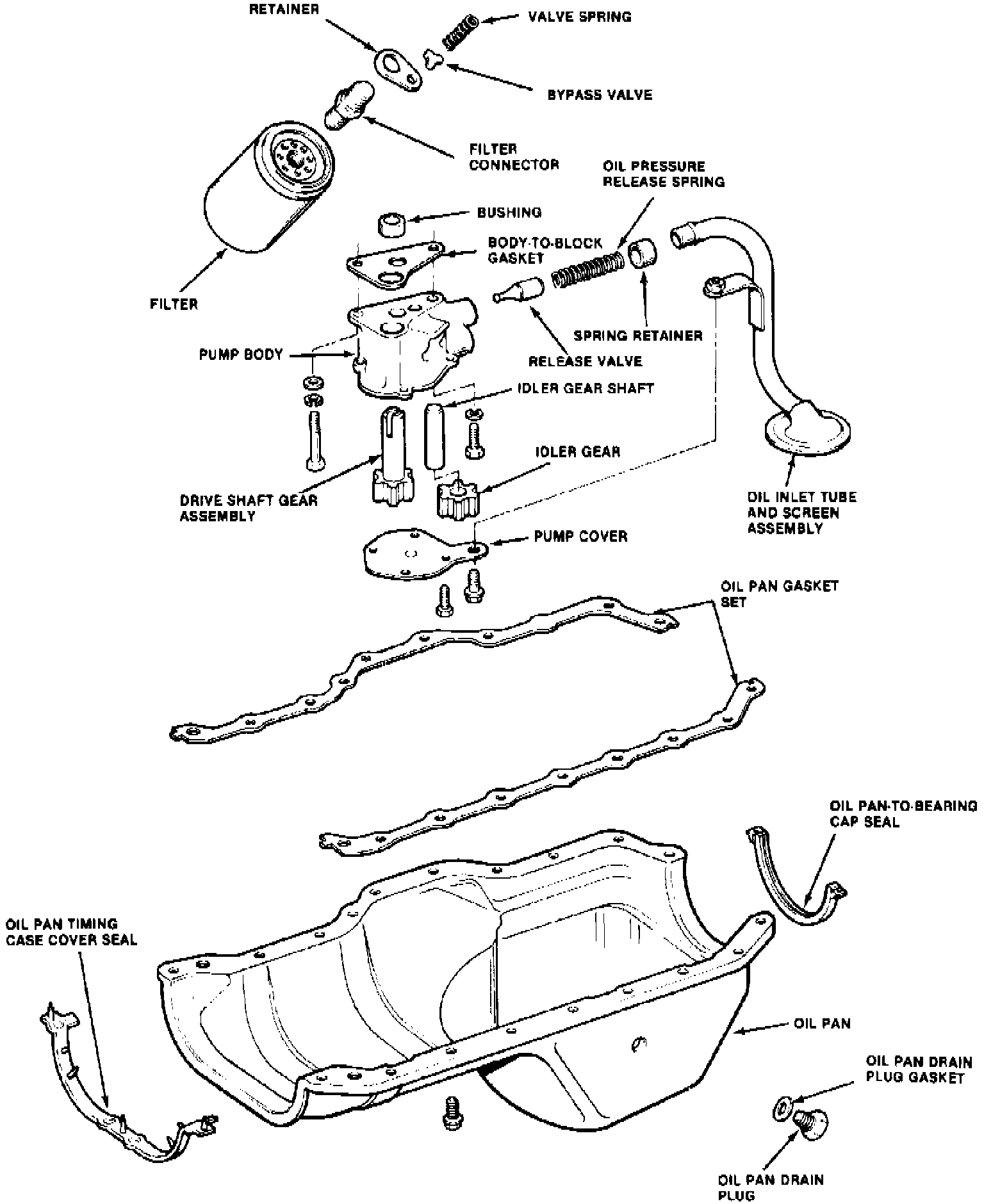 6. Reverse procedure to install. Tighten oil pan retaining bolts to specifications.