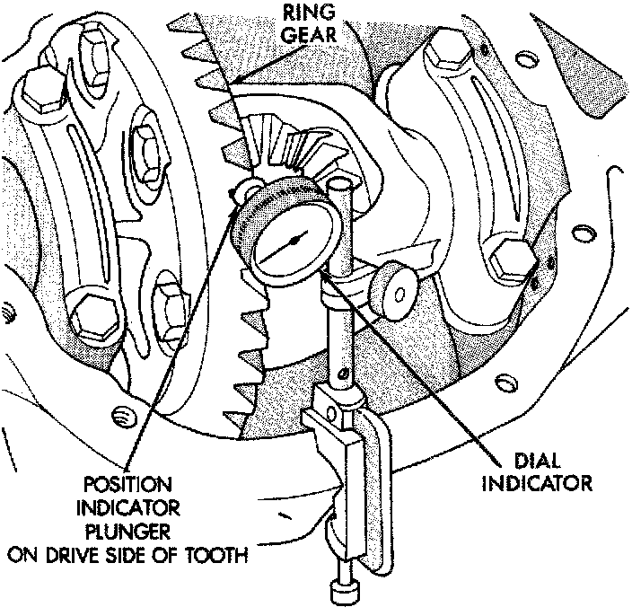 3. Rotate the ring gear to the position of the least backlash. Mark the gear so that all future backlash measurements will be taken with the same gear teeth meshed.